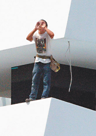 一名莊姓裝潢工人昨天站在臺(tái)北市信義路五段陳水扁“寶徠花園廣場(chǎng)”住宅旁的樣品屋屋頂,對(duì)著陳水扁所住豪宅,高喊“阿扁你對(duì)不起臺(tái)灣人民”,還要他把貪污的錢(qián)給還出來(lái)!(圖片來(lái)源:臺(tái)灣《聯(lián)合報(bào)》)