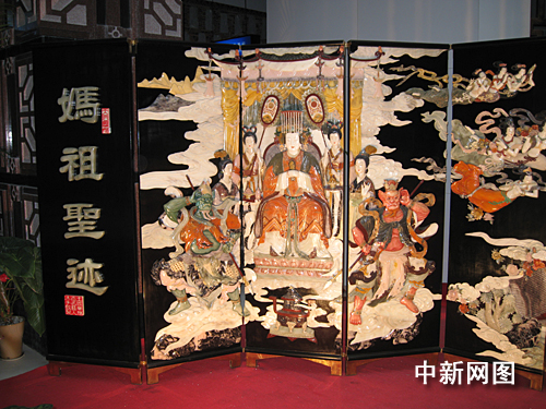 中新網(wǎng)10月25日電 圖為位于中國閩臺(tái)緣博物館內(nèi)的巨幅玉石鑲嵌《媽祖》。作品高2米,長30米,歷時(shí)5年,采用天然玉、石、珍珠、瑪瑙、翡翠、鉆石鑲嵌。該畫根據(jù)《敕封天后志》、《天后顯圣錄》以及民間有關(guān)媽祖?zhèn)髡f繪成,以連續(xù)不斷的立體與浮雕畫面展現(xiàn)了媽祖救海難、護(hù)使節(jié)、解旱治病的圣跡。