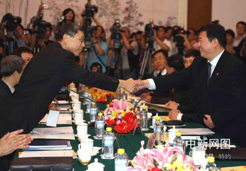 6月12日上午,海峽兩岸關(guān)系協(xié)會(huì)副會(huì)長孫亞夫(右)與臺(tái)灣海峽交流基金會(huì)副董事長高孔廉在北京釣魚臺(tái)5號(hào)樓協(xié)商兩岸周末包機(jī)。中新社記者 任晨鳴 攝