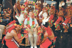 大陸踩線團(tuán)團(tuán)長(zhǎng)范貴山,被當(dāng)成臺(tái)灣少數(shù)民族大頭目,接下許愿酒,連干三杯,許下北京奧運(yùn)成功、兩岸旅游“火火紅紅”、兩岸人民幸福美滿(mǎn)等三個(gè)愿望。