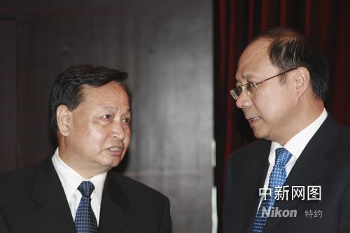 羅清泉(左)與國臺(tái)辦常務(wù)副主任鄭立中交談。張暢 攝