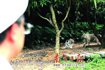 準(zhǔn)備送給高雄的兩只白虎為一公一母,公的叫“昭!,母的叫“歡樂(lè)”。看到客人來(lái)了,“昭!焙汀皻g樂(lè)”不時(shí)站起來(lái)走幾步,秀秀身材;又不時(shí)把臉朝向觀眾,配合鏡頭。訪問(wèn)團(tuán)成員紛紛站到鏡頭前,與兩只白虎來(lái)個(gè)“遠(yuǎn)距離合照”。