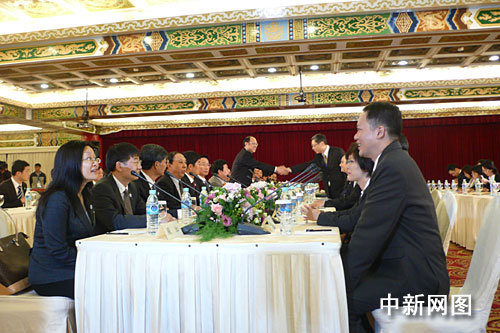圖為大陸海協(xié)會常務(wù)副會長鄭立中與臺灣海基會副董事長高孔廉親切握手。于晶波 攝