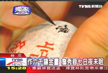 中新網(wǎng)11月4日電 臺北“江陳會談”今天舉行,臺灣海基會準(zhǔn)備了鑲有6000金字的“和平協(xié)商,共創(chuàng)雙贏”的藝術(shù)字畫,送給陳云林。據(jù)臺灣TVBS報道,字畫創(chuàng)作者、臺灣藝術(shù)家詹秀蓉透露,為了這幅字畫,她不眠不休花了7天時間,才在最后一刻完成。不過,見證兩岸歷史時刻,詹秀容說,她與有榮焉,所以分文不取。