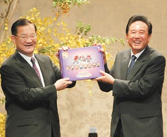 國民黨榮譽(yù)主席連戰(zhàn)(左)4日以晚宴款待海協(xié)會會長陳云林(右),并致贈臺灣名產(chǎn)“鐵蛋”。(圖:臺灣《聯(lián)合報》)