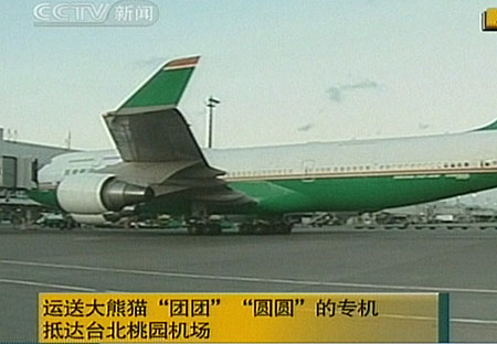 中新網(wǎng)臺(tái)北12月23日電 今天下午17時(shí)03分左右,大陸贈(zèng)臺(tái)大熊貓“團(tuán)團(tuán)”、“圓圓”搭乘長榮航空公司波音747專機(jī)飛抵臺(tái)北桃園機(jī)場。