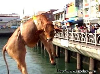 據(jù)悉,這頭大黃牛原本用船運輸,但在準備接駁到岸邊卡車上時,綁它的繩索突然斷掉,才造成這一起意外落海事件。消防隊員表示,這還是第一次接到“吊!钡娜蝿铡