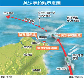 據(jù)臺灣《中國時報》報道,美沙寧號重一萬六千多噸,行經(jīng)臺北縣鼻頭角外海三十三海里處,當時因米塔臺風影響,十一級陣風掀起巨浪,船艙進水、失去平衡,經(jīng)船長宣布棄船后,約僅五六分鐘即沉沒海中。由于這起船難發(fā)生在素有“臺灣百慕達”之稱的鼻頭角外海,此處海域一向極兇險,過去曾發(fā)生多次海難,使這起船難更顯詭異。