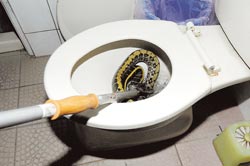 中新網(wǎng)5月11日電 一朝被蛇咬,十年怕馬桶?據(jù)臺(tái)灣《中國時(shí)報(bào)》報(bào)道,住南投埔里鎮(zhèn)山區(qū)的林姓男子,日前坐馬桶小解時(shí),突感下體一陣劇痛,回頭赫見一條巨蛇躲在馬桶里昂首吐舌信,咬破他的陰囊鮮血直流,趕緊負(fù)傷求助鄰人送醫(yī);醫(yī)生說所幸黑眉錦蛇無毒,否則連小命也不保。
