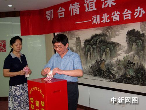 連日來,不斷有湖北社會團體、企業(yè)和民眾致電湖北省臺辦,表示要為災區(qū)捐款、捐物。二十日下午,湖北省臺辦舉行捐款儀式,省臺辦機關(guān)捐出二十萬元人民幣,省臺辦機關(guān)工作人員還現(xiàn)場捐款一點四萬元。二十日,長江三峽工程開發(fā)總公司和武漢鋼鐵集團公司通過臺辦系統(tǒng)和海協(xié)會,分別向臺灣災區(qū)捐款一千萬元和五百萬元。