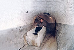 兩條密道皆為二點(diǎn)三米寬,二點(diǎn)一米高,造型有如螺旋式走道,一路向下盤旋,若不小心可能就會摔個大跤,寬度可容納二至三人同時(shí)并行。最特殊的是,西側(cè)的密道旁,還設(shè)計(jì)成約一人寬,以磨石子為底,類似溜滑梯的滑行道。飯店說法是,這種設(shè)計(jì)便于讓行動不便的人員使用。由于滑道兩端距離約七十米,又是一路往下盤旋,看過的飯店人員戲稱,這大概是世界最長的“水泥溜滑梯”。