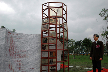 臺(tái)灣省宜蘭縣史館二十九日在縣議會(huì)為反日殖民統(tǒng)治先驅(qū)蔣渭水舉行紀(jì)念物揭幕典禮,蔣渭水孫子蔣朝根(右)親自參加!爸醒肷纭眻D 沈如峰 攝