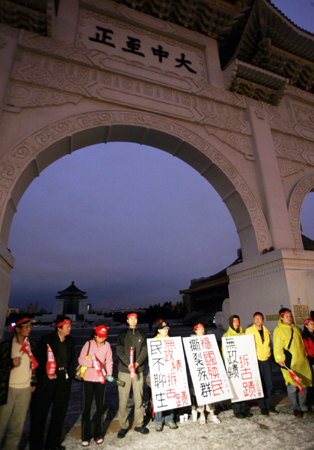 臺(tái)北中正紀(jì)念堂前的“大中至正”牌匾即將拆除,紅衫軍“自主公民協(xié)會(huì)”成員六日熬夜守護(hù)牌匾,抗議臺(tái)當(dāng)局拆除古跡。有路過的綠營支持者罵三字經(jīng),引發(fā)沖突,隨即被警方帶走,避免紛爭(zhēng)!爸醒肷纭眻D 張皓安 攝