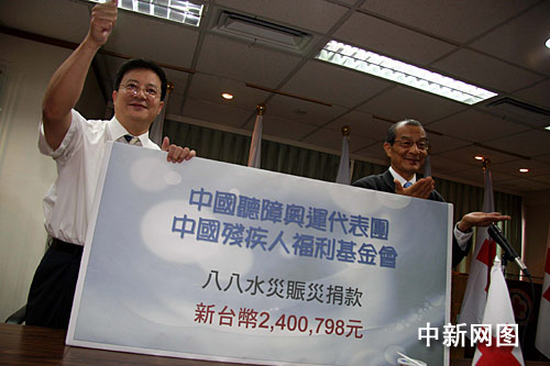 在簡短的捐贈儀式上,中國聽障奧運代表團團長賈勇表示,這次前來臺北參加第二十一屆聽障奧運會,借此機會,他代表中國聽障奧運代表團和中國殘疾人福利基金會,向“八八水災”罹難的同胞們捐款。希望為受災同胞加油,災區(qū)重建工作盡快回復。同時希望擴大包括運動員在內(nèi)的兩岸交流,增進彼此了解,共同抗擊自然災難。