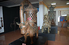 山莊內展出的三星堆(東漢光武帝)青銅古文物,系明月居總監(jiān)黃春隆的珍藏品,以青銅器為主,包括天祿、馬車、春秋時代的編鐘、銅牛燈等數(shù)百件。