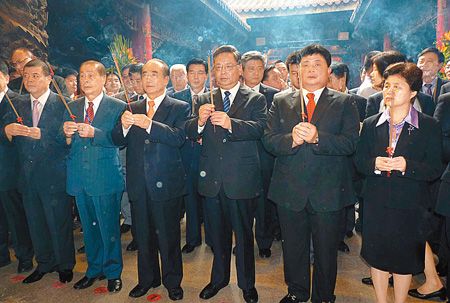 福建省經(jīng)貿(mào)文化交流團(tuán)、莆田市莆臺(tái)交流協(xié)會(huì)團(tuán)及中華媽祖文化交流協(xié)會(huì)團(tuán)等,約一百一十多位成員,受到臺(tái)“立法院長(zhǎng)”王金平、臺(tái)中縣副縣長(zhǎng)陳茂淵、議長(zhǎng)張清堂,及鎮(zhèn)瀾宮董事長(zhǎng)顏清標(biāo)等人的熱烈歡迎。