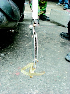 一起停等的騎士看了都嚇了一跳,要王婦把車推到武陵派出所,請(qǐng)警員幫忙抓蛇;她直奔派出所,但警員不諳抓蛇,再請(qǐng)來(lái)消防隊(duì)員幫忙。