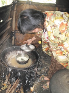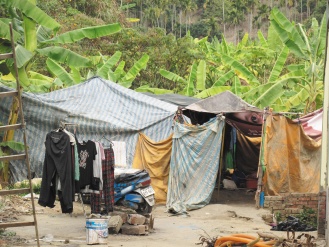 簡陋破落帳篷搭在香蕉園里,卓姓夫妻與兒子擠在不到兩坪的空間里;室內(nèi)堆放著臟亂衣物等用品,睡覺的地方用木板稍隔開,陳設(shè)比起工寮還要簡陋。緊鄰廚房僅有一只燒柴鍋子,卓家女主人鍋子正在蒸蛋,蒸蛋的水暗沉,她說:“這是早餐!