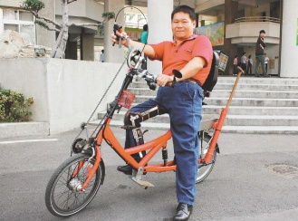 “我終于可以騎自行車兜風(fēng)了!”他說,曾5度騎摩托車環(huán)島,現(xiàn)在也可以騎自行車環(huán)島;因手動(dòng)自行車非常耗體力,最近他在自行車后方加裝電動(dòng)裝置,電池充完電可以跑六、七個(gè)小時(shí),手動(dòng)騎累了,就轉(zhuǎn)換成電動(dòng)。