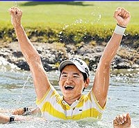 中新網4月6日電 據(jù)臺灣媒體報道,臺灣高球天后曾雅妮5日在LPGA(Ladies Professional Golf Association,女子職業(yè)高爾夫巡回賽)四大賽之一、納比斯科錦標賽中擊敗世界前10名高手,奪下后冠,獲得30萬美元獎金,也是賽史上第1位摘冠的華人球員。曾雅妮奪冠后激動得舉起雙手,興高采烈地依照傳統(tǒng)躍進水池中慶祝。
