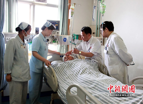 中新網(wǎng)長(zhǎng)沙5月6日電(劉柱 伍西明)“多虧醫(yī)院救了我丈夫的命,歡迎你們來(lái)臺(tái)灣做客!”在湖南湘雅醫(yī)院重癥醫(yī)學(xué)科(ICU病房),剛剛從臺(tái)灣趕來(lái)長(zhǎng)沙的臺(tái)胞患者梁登輝的夫人對(duì)病房里的醫(yī)生和護(hù)士們連聲感謝。