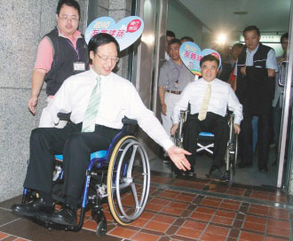 江宜樺與郝龍斌2日在ENJOY餐廳共同貼上“友善建筑”貼紙,象征2010年友善建筑的評(píng)選活動(dòng)正式開(kāi)跑;隨后兩人也坐上輪椅,從ENJOY餐廳出發(fā),一路經(jīng)過(guò)市府走廊,到無(wú)障礙設(shè)施廁所,體驗(yàn)身障者的不便。