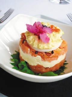 春秋烏來渡假酒店也在櫻花季節(jié)推出櫻花季套餐,用櫻花入菜,像櫻花煙熏鮭魚塔,以煙熏鮭魚加入洋蔥碎、酸豆及日本四季紅,中間夾入酸奶與奶油起司泥,酸甜可口,新推櫻花甜點也很有特色。