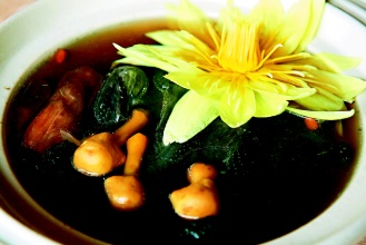 劉邦傳說,新興園的烏骨雞湯和一般雞湯不同,以蓮蓬、蓮子等堅果類食材清燉,加上巴西蘑菇,營養(yǎng)程度高。
