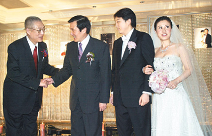 中新網(wǎng)6月15日電 據(jù)臺(tái)灣《聯(lián)合報(bào)》報(bào)道,國民黨秘書長吳敦義次子吳子文14日在臺(tái)北舉行結(jié)婚酒會(huì)與女方歸寧宴,馬英九、“行政院長”劉兆玄、“立法院長”王金平、國民黨主席吳伯雄等黨政高層出席致賀,現(xiàn)場冠蓋云集。