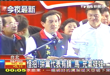 中新網(wǎng)7月21日電 據(jù)臺(tái)灣TVBS報(bào)道,馬英九參選國(guó)民黨主席,20日晚到臺(tái)北縣造勢(shì),有2位民眾激動(dòng)陳情,還有許多競(jìng)爭(zhēng)黨代表的候選人借機(jī)賣力造勢(shì),有人打造吉祥物,有人居然拿出男性充氣娃娃,臉部畫成馬英九搶鏡頭。