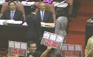 據(jù)臺(tái)灣TVBS報(bào)道,吳敦義還沒(méi)上臺(tái),事前保密到家的民進(jìn)黨“立委”們,突然拿著白布條、標(biāo)語(yǔ)霸占主席臺(tái),大喊“白賊義,道歉”,稱吳敦義香港行的說(shuō)法一變?cè)僮,有誠(chéng)信問(wèn)題。吳敦義則留在原位,國(guó)民黨人上前安撫,也做護(hù)駕動(dòng)作,避免與民進(jìn)黨“立委”發(fā)生肢體沖突。