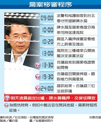 高院將由三位庭長、兩位法官組成的五人小組,于下午1點在三樓禮堂公開抽簽分案,從81位庭長、法官當中抽出承審股別,扁案卷證就送合議庭辦公室;只要不是下午有庭期的合議庭,原則上會立即閱卷,開庭決定是否接押阿扁。