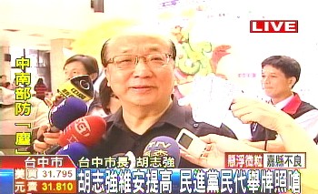 胡志強日前曾遭到一名大學生亮刀嗆聲,維安問題再度被關(guān)注。臺中市警局擬提高維安規(guī)格,比照“直轄市長”,胡志強表示尊重專業(yè),絕對配合警方。