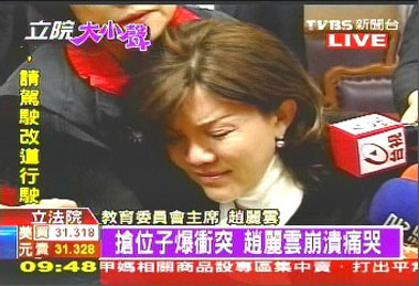 而上個星期才因為沖突昏倒送醫(yī)的“主席”趙麗云,26日再度看到這樣混亂場面,一度痛哭!敖逃瘑T會主席”趙麗云:“我們要開會,我們要按規(guī)則開會,請所有的不管那個黨派的,要對得起人民,我們是拿薪水來開會,不是來打架的!