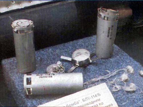據(jù)美國(guó)科學(xué)家網(wǎng)站資料指出,美軍石墨炸彈在空軍編號(hào)為BLU─114/B,是透過(guò)在易拉罐大小的罐內(nèi)裝進(jìn)大量石墨絲,然后將這些石墨罐再裝進(jìn)較大的集束彈體中,以子母彈的方式進(jìn)行投射,石墨彈在散開后,尾部還會(huì)掛載降落傘,以利于讓罐內(nèi)石墨絲大面積散開,并平均落在發(fā)電廠或高壓電纜上,讓電纜瞬間燒毀。
