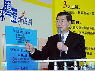馬英九發(fā)言后,蕭萬長作為“經(jīng)濟發(fā)展總設(shè)計師”上臺發(fā)表馬蕭“全球連結(jié)與產(chǎn)業(yè)再造”第二波經(jīng)濟新藍圖。