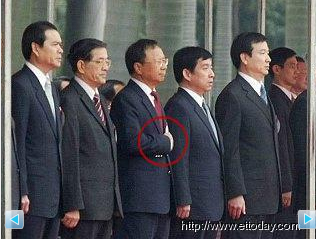 只是,偏偏有人愛出狀況,“教育部長”杜正勝則是給自己升官,也比了扶手禮,而“總統(tǒng)府副秘書長”陳其邁與“新聞局長”謝志偉則是變成了軍官,沒戴帽卻比出舉手禮。