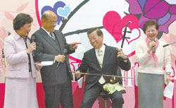 謝長廷還用二胡拉奏《月亮代表我的心》。他形容自己很“浪漫”,感激妻子游芳枝一路相挺,接著即興創(chuàng)作一首情詩:《我在這里愛你》:“當(dāng)我說愛你的時候,風(fēng)中的松樹吟詩般的葉子輕輕唱出你的名字:芳枝!