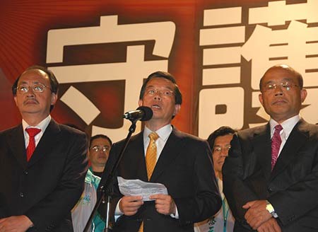 22日晚,在臺灣地區(qū)領導人選舉中敗選的民進黨候選人謝長廷(中)面對支持者深深鞠躬,他表示承認、并會承受選舉結果,也會為敗選負起責任,但是他不會離開臺灣。謝長廷目前擔任民進黨主席。此前,謝長廷表示,如果這次敗選,將永遠退出臺灣的政壇。