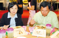 民進(jìn)黨主席蔡英文(左)吃著印有自己肖像的便當(dāng)時(shí),忍不住欣喜滿足,一旁的嘉義縣長陳明文也津津有味地品嘗。