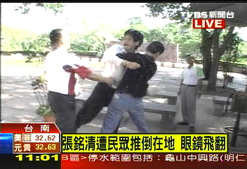 環(huán)球時報駐臺北特約撰稿人周先報道:據(jù)臺灣中天電視臺21日報道,抵臺進行學術(shù)交流的大陸海協(xié)會副會長張銘清21日上午在臺南市安平古堡參觀時,被綠營支持者推倒在地,當張銘清準備乘車離開時,有“臺獨”分子甚至跳上張的座車車頂狂踩,試圖阻止張銘清離開。另據(jù)臺灣TVBS電視臺消息,張銘清后腦勺被打,連眼鏡都被推飛了出去。
