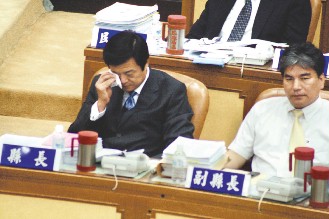 臺北縣長周錫瑋(左)30日談及臺中縣市合并“升格”案時落淚表示,該案進度如果超前臺北縣“升格”案,將辭去縣長職務。(圖片來源:臺灣《聯(lián)合報》)
