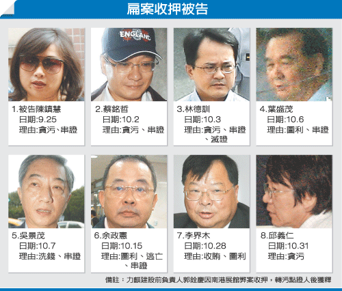 最早被收押的是卷入陳水扁家族洗錢疑案的力麒建設公司負責人郭銓慶,他在9月12日就因被臺北地檢署查出另涉世貿南港展覽館興建工程行賄標案評選委員弊案,檢察官傳喚他到案,向臺北地方法院聲請羈押禁見獲準。此后,除了機要費案和洗錢密賬案外,又開始不斷開花。案外案不斷,以致在一個多月內連續(xù)收押陳水扁任內出納陳鎮(zhèn)慧、“總統(tǒng)夫人助理”蔡銘哲、前陳水扁辦公室主任林德訓、泄密的前“調查局長”葉盛茂、陳水扁妻子哥哥吳景茂、前“內政部長”余政憲等人。