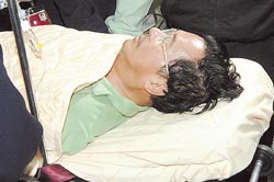 陳水扁躺在擔架上,滿臉胡渣。
