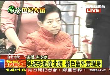 下午2點(diǎn)15分,吳淑珍穿著橘色舊外套,在兒子陳致中及陳水扁高中同學(xué)吳文清陪伴下,抵達(dá)臺(tái)北地方法院,進(jìn)入法院后還用手遮住,打了一個(gè)呵欠;雖然場(chǎng)外還是有挺扁和反扁民眾聚集叫囂,但人數(shù)明顯比前幾次減少了。