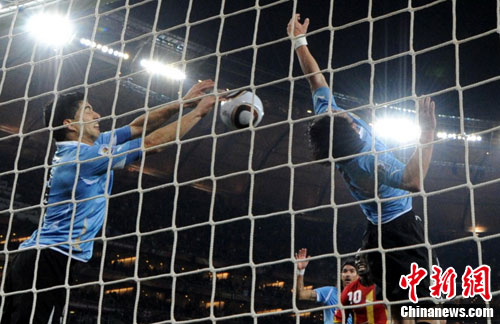 面對這個(gè)禁區(qū)內(nèi)的故意手球,主裁判當(dāng)即判罰紅牌加點(diǎn)球。但是畢竟這個(gè)手球保證了烏拉圭的球門沒有失守,他們贏得了一個(gè)點(diǎn)球機(jī)會(huì)。隨后吉安主罰的點(diǎn)球擊中橫梁,已經(jīng)走到球員通道門口的蘇亞雷斯回望,不禁喜形于色。