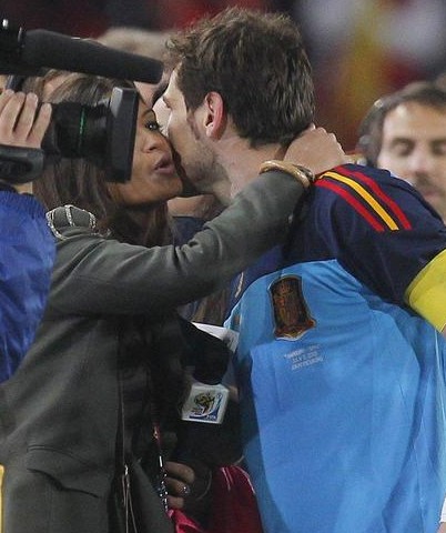 比賽結(jié)束后,身為體育主播的卡西美艷女友自然要采訪(fǎng)西班牙的功臣,訪(fǎng)談結(jié)束后,她在眾目睽睽之下現(xiàn)場(chǎng)為圣卡西送上香吻。