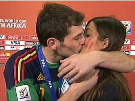 西班牙在首戰(zhàn)對陣瑞士的小組賽中被中場費南德斯攻進一球,卡西利亞斯撲救不及,讓西班牙最后輸?shù)舯荣。當時,卡西的美艷記者女友卡波內(nèi)羅就站在球門后。她在賽后現(xiàn)場報導時毫不客氣地質(zhì)問男友:“你是怎么把比賽搞砸的?”