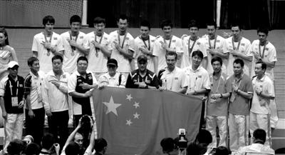 艱難戰(zhàn)勝韓國隊(duì),賽后李永波帶領(lǐng)男隊(duì)打出特有的慶祝手勢。周民 攝