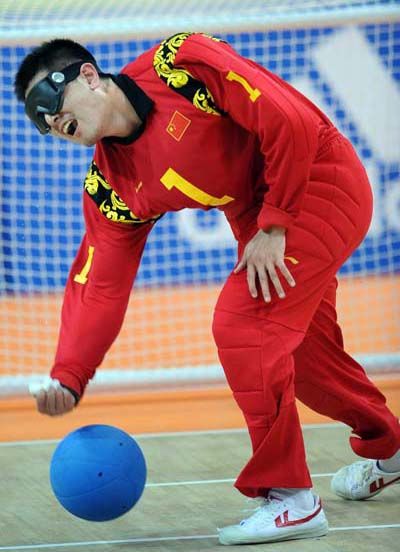 盲人門球運(yùn)動(dòng)是根據(jù)盲人視力障礙特點(diǎn)而專門設(shè)計(jì)的一項(xiàng)集體球類項(xiàng)目,它需要運(yùn)動(dòng)員根據(jù)觸覺來確定自己在場(chǎng)上的位置、方向;根據(jù)聽覺來判斷球的方向、速度,從而迅速做出反應(yīng)。這項(xiàng)運(yùn)動(dòng)的形式適合于盲人視覺功能障礙的局限,集安全性、競(jìng)技性、觀賞性于一體,既突出運(yùn)動(dòng)員個(gè)人技術(shù)又強(qiáng)調(diào)團(tuán)隊(duì)配合。有人作了這樣的比喻:“盲人門球運(yùn)動(dòng)是一項(xiàng)球似籃球,球門似足球,而擲球動(dòng)作像保齡球的運(yùn)動(dòng)! (來源: 亞殘運(yùn)會(huì)官方網(wǎng)站)
